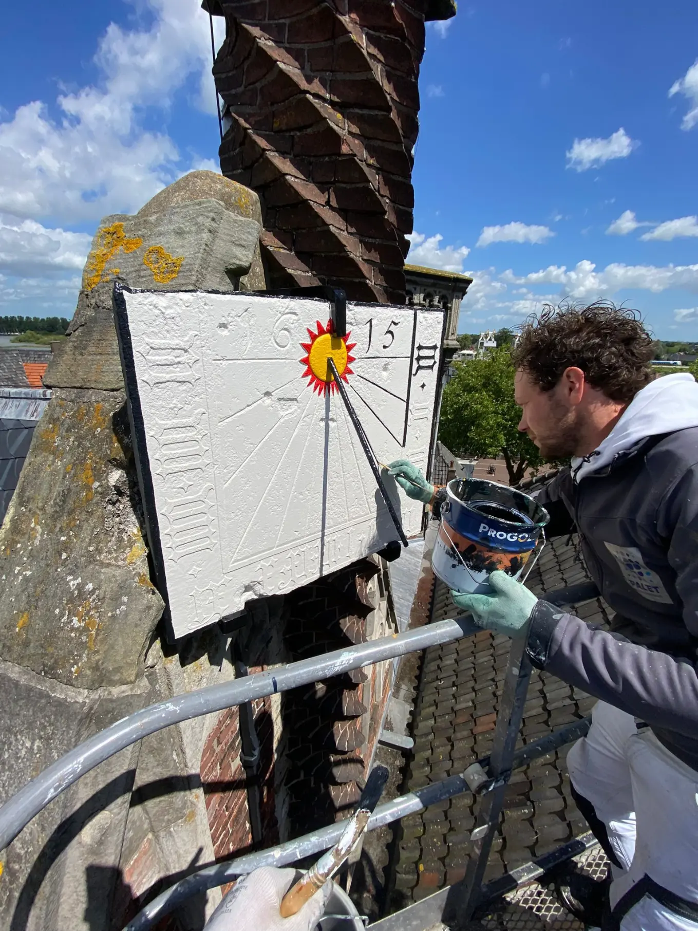 De oudste zonnewijzer van Overijssel - en de een-na-oudste van Nederland - is te vinden in Kampen. Door verbouwingen en het verlies van kleur was dit eeuwenoude stukje geschiedenis slecht zichtbaar. Maar daar hebben collega's Sijmen en Herman verandering in gebracht!