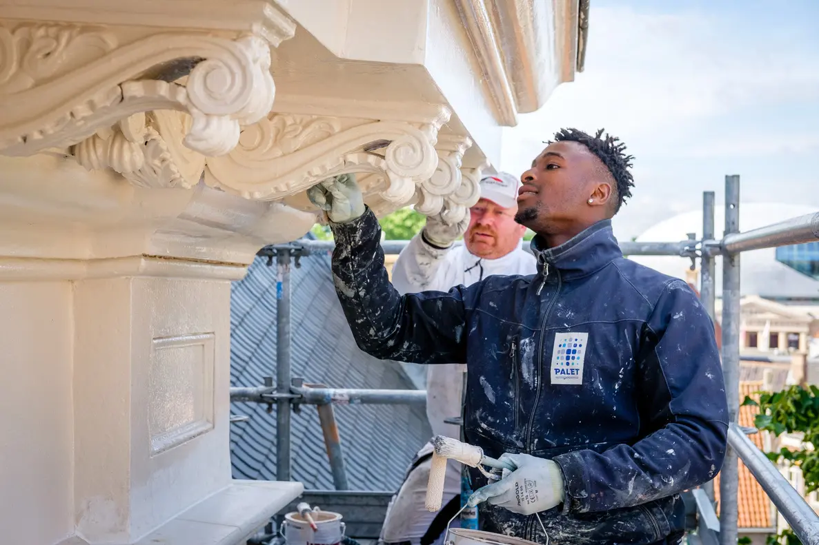 Om de sierlijke gootklossen met houtsnijwerk goed aan te kunnen pakken, liet Palet ze van tevoren reinigen. Vervolgens werd elke klos zorgvuldig geschuurd en weer in de verf gezet. “Dat was wel de grootste opgave. Vier mensen hebben twee weken lang bovenin gezeten om aan de goot te werken.”